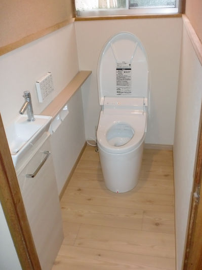 おじいちゃんがお一人で住まわれているお宅です。お手入れが楽で、扱いも簡単なトイレと、手を洗うカウンターが欲しいと、ご希望されました。TOTOGG3はタンクレスのように見えて、実は見えないタンクがあります。なのでとてもスマートです。
