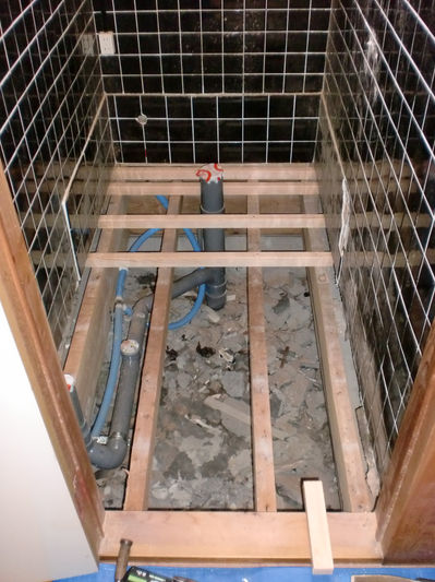 手洗いカウンターを取り付けるので、床、壁は撤去します。新たに床組を作り、合板をはっていきます。