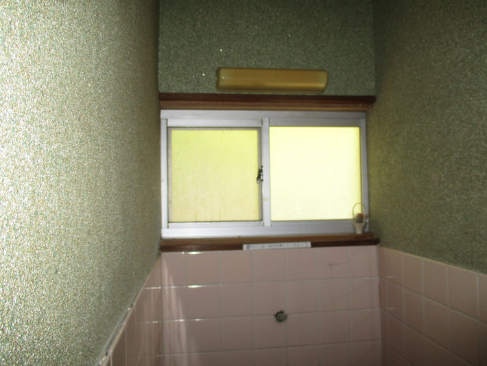 壁、ドア撤去。男女トイレを仕切ってあった壁を撤去したので、柱、梁を補強します。